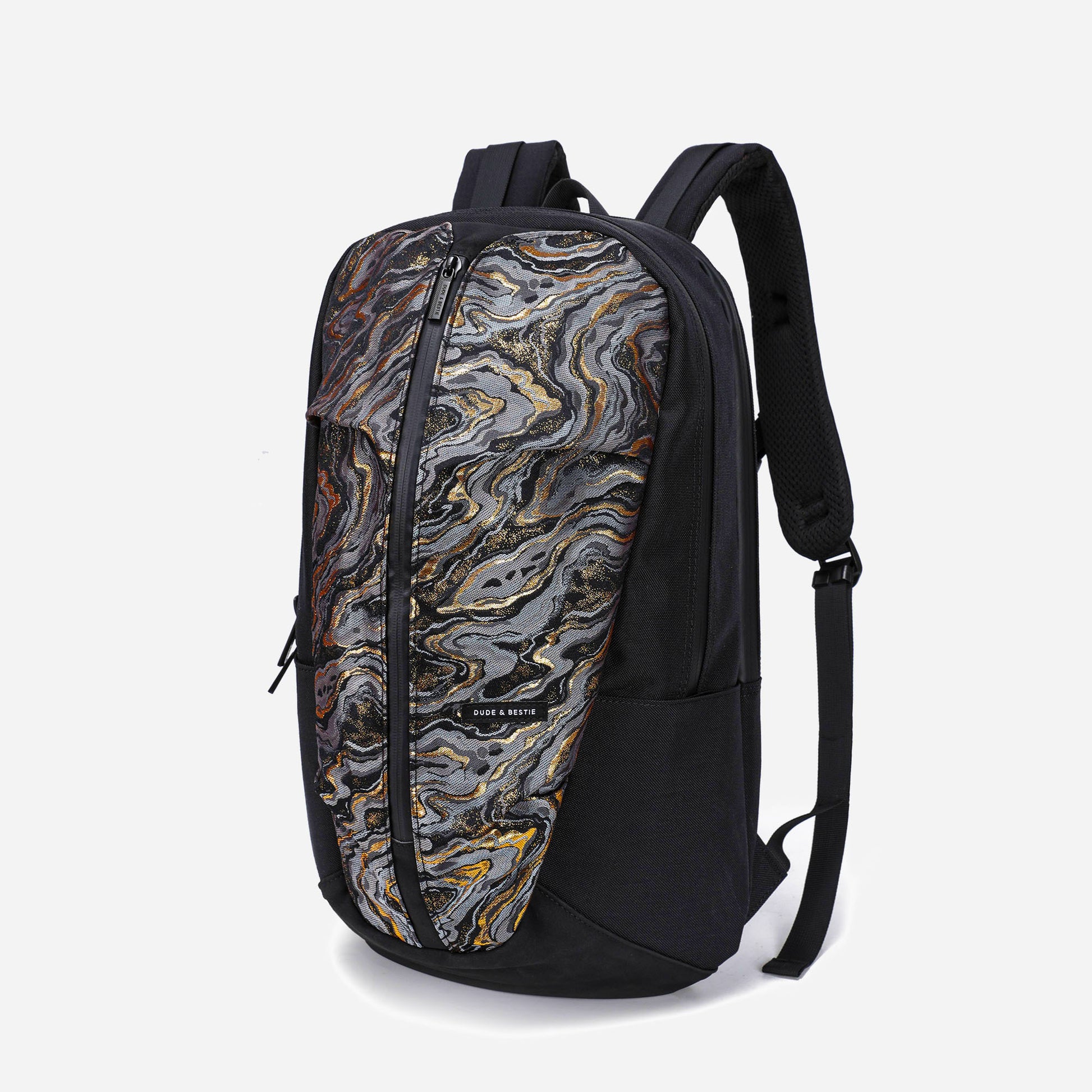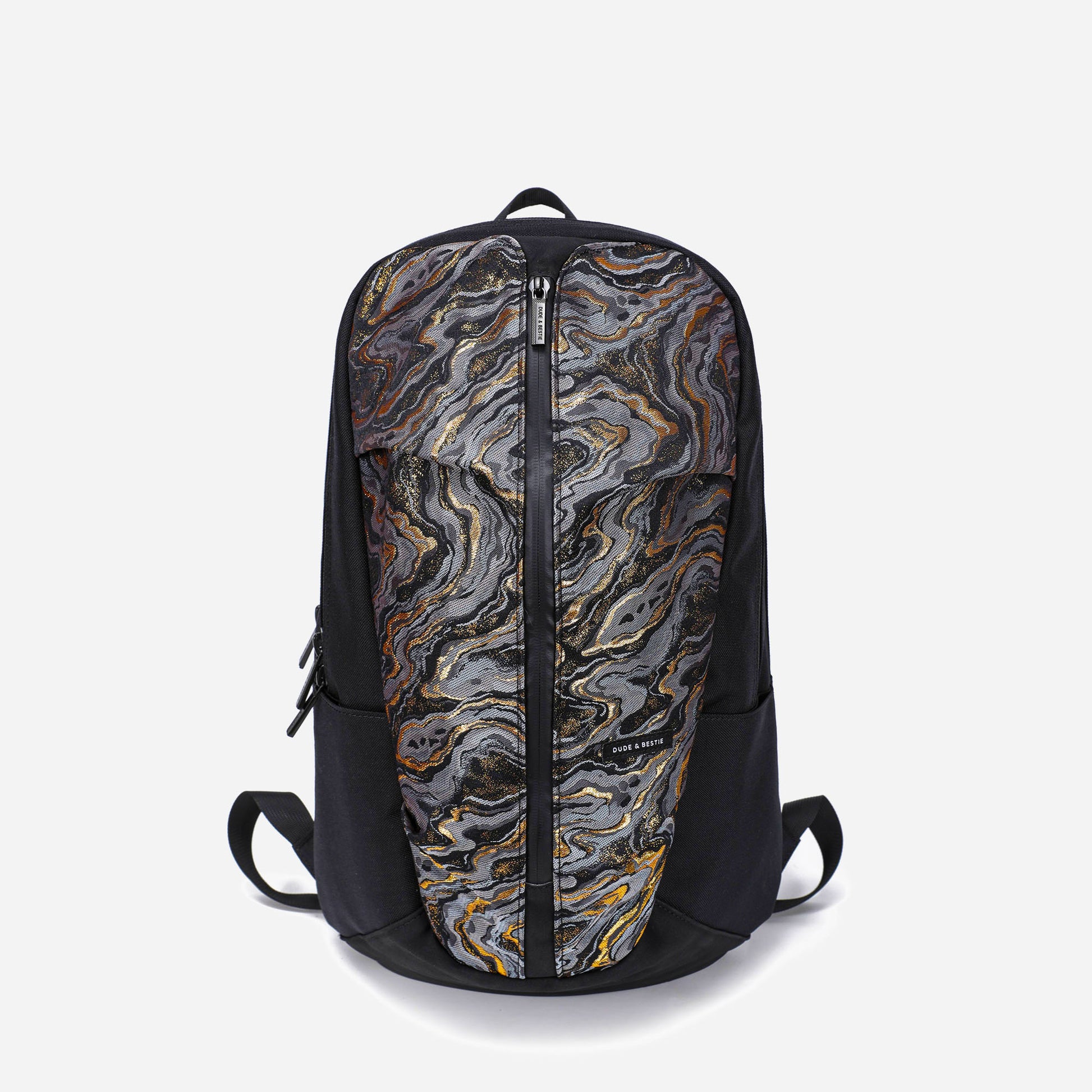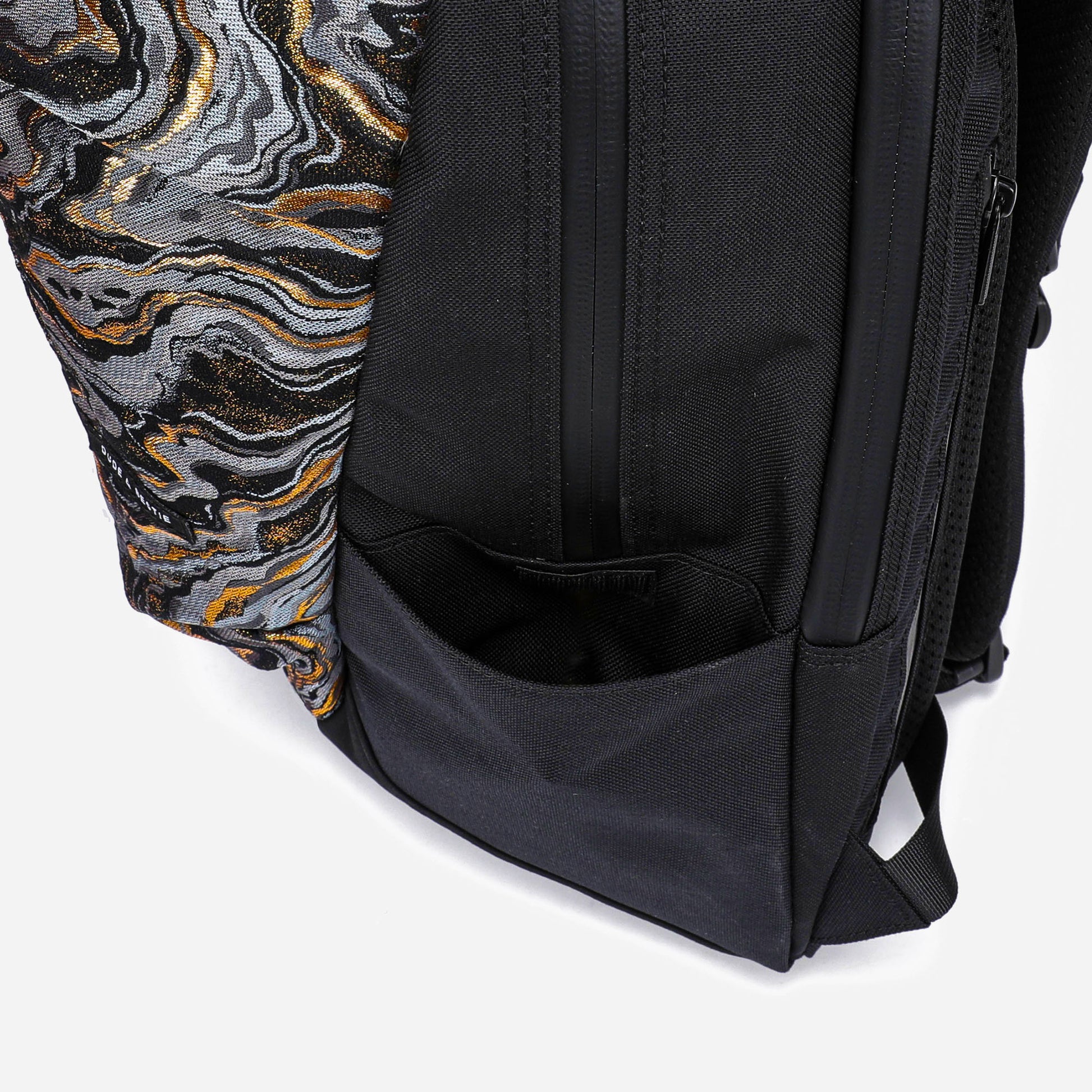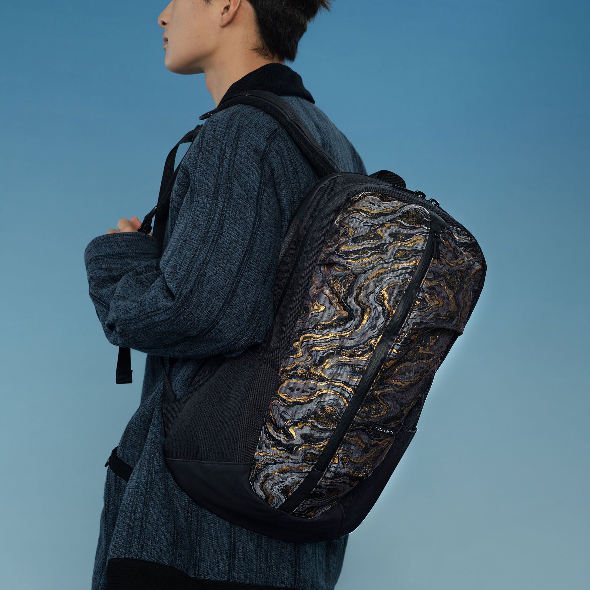 This limited edition backpack features exquisite Nishijin-ori fabric from Kyoto, adding a unique touch to its sleek, water-resistant nylon design. It fits up to a 17-inch laptop and is perfect for daily use with multiple pockets and a modern, minimalist aesthetic.