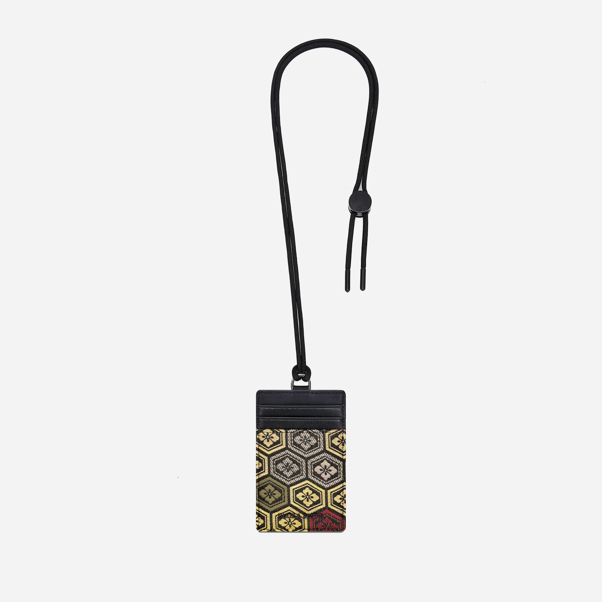 This Vertical Card Holder is crafted from luxurious Japanese Nishijin-ori and black-grained calfskin for a fashionable and functional look. With three card slots and a transparent badge window, you can easily organize and store your ID and credit cards. The adjustable and removable shoulder strap makes it comfortable to wear around your neck or hook to a bag.