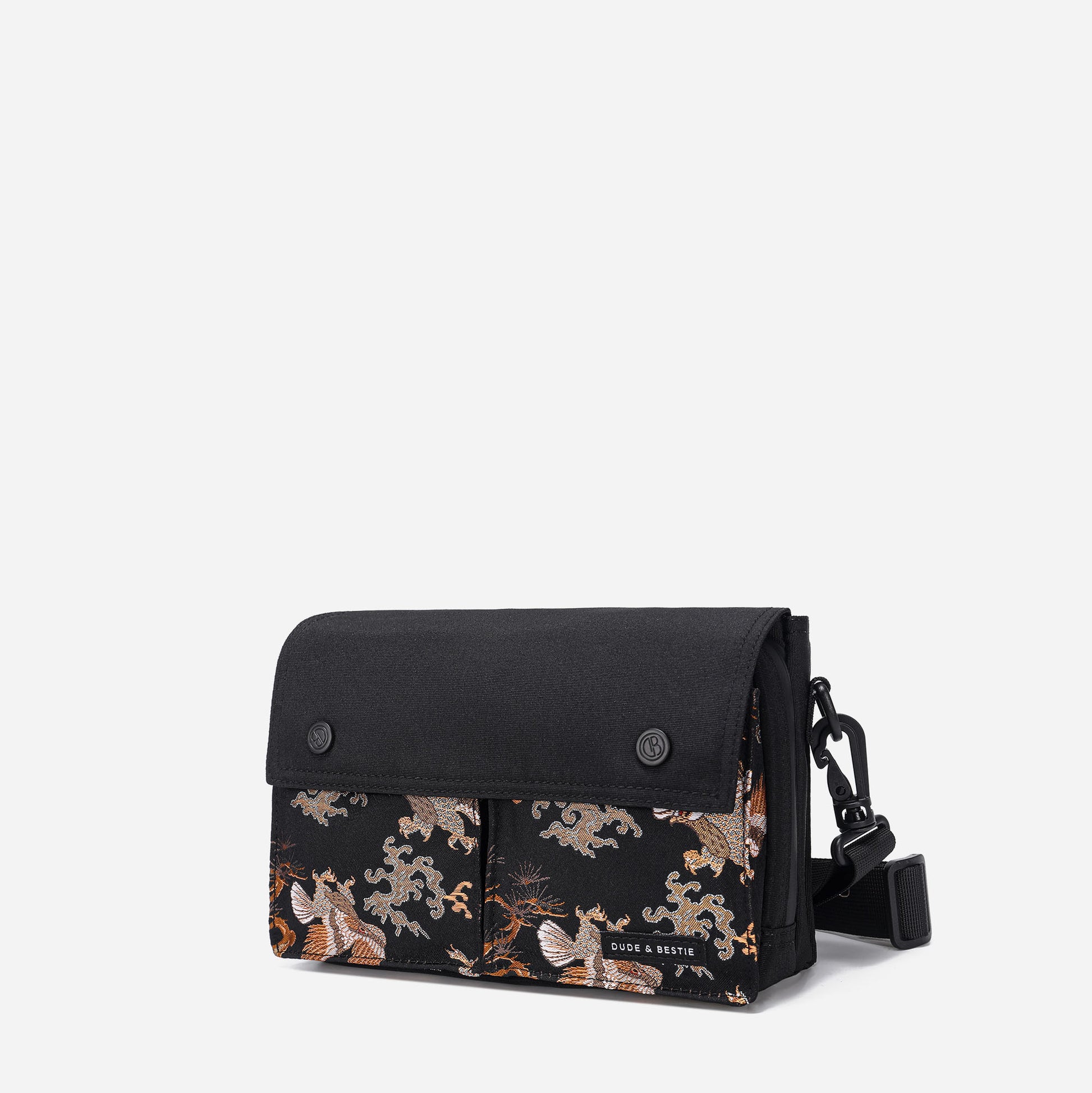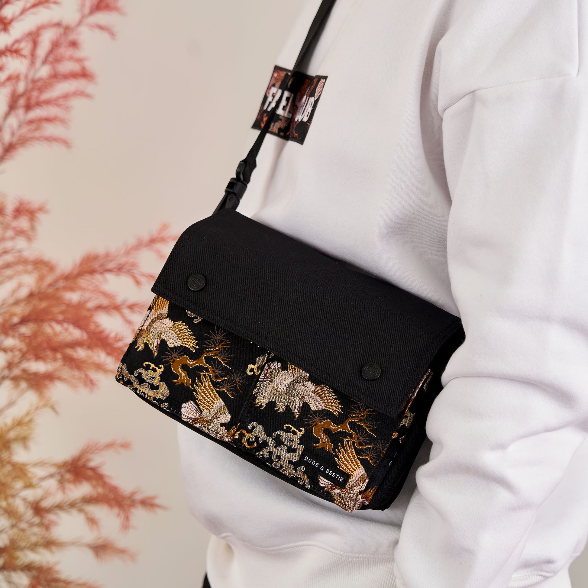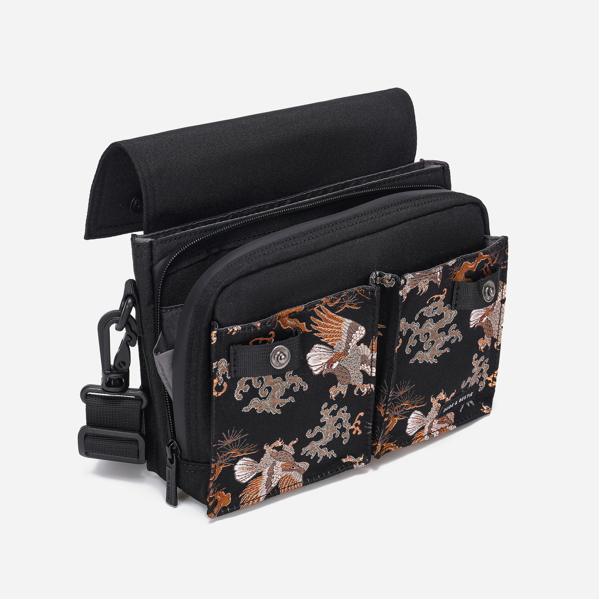 Crafted with traditional Japanese Nishijin-ori fabric from Kyoto, this sophisticated crossbody bag features the iconic "Matsu-Taka" (Pine and Eagle) motif, symbolizing prosperity and longevity. Designed for both style and functionality, its sleek silhouette and thoughtful compartments make it a versatile companion for daily adventures or special occasions. Embrace the timeless artistry of Japanese craftsmanship while enjoying the convenience of a modern, practical design.