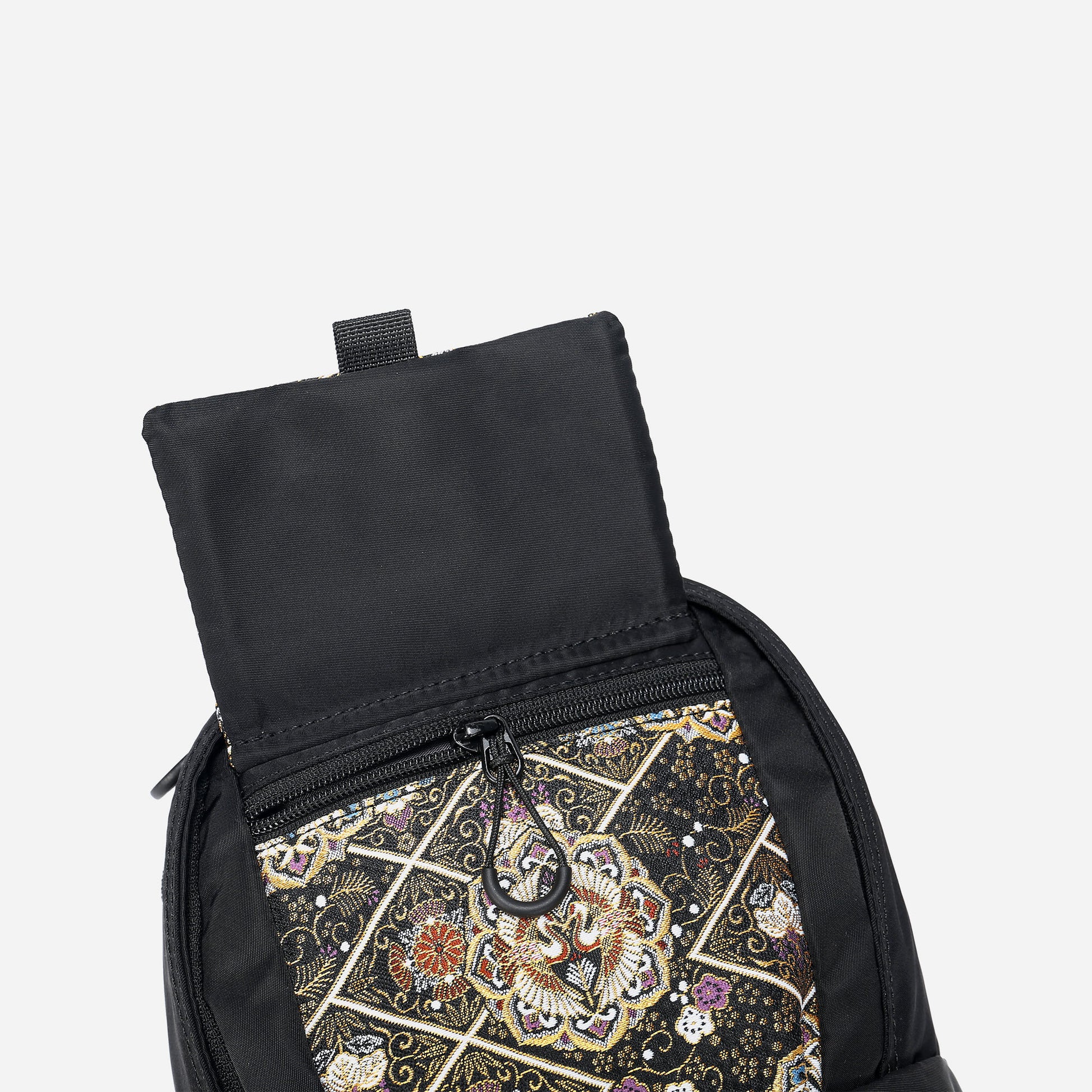 Exclusive limited edition Mini Gemini Two-way Bag offers a luxurious take on the traditional silk fabric of Nishijin-ori. The delicate crane pattern and flower are timeless symbols of peace and beauty, lending an elegant taste to any room.