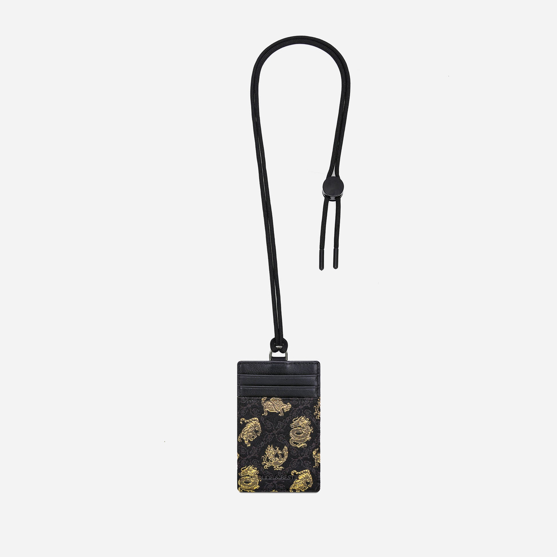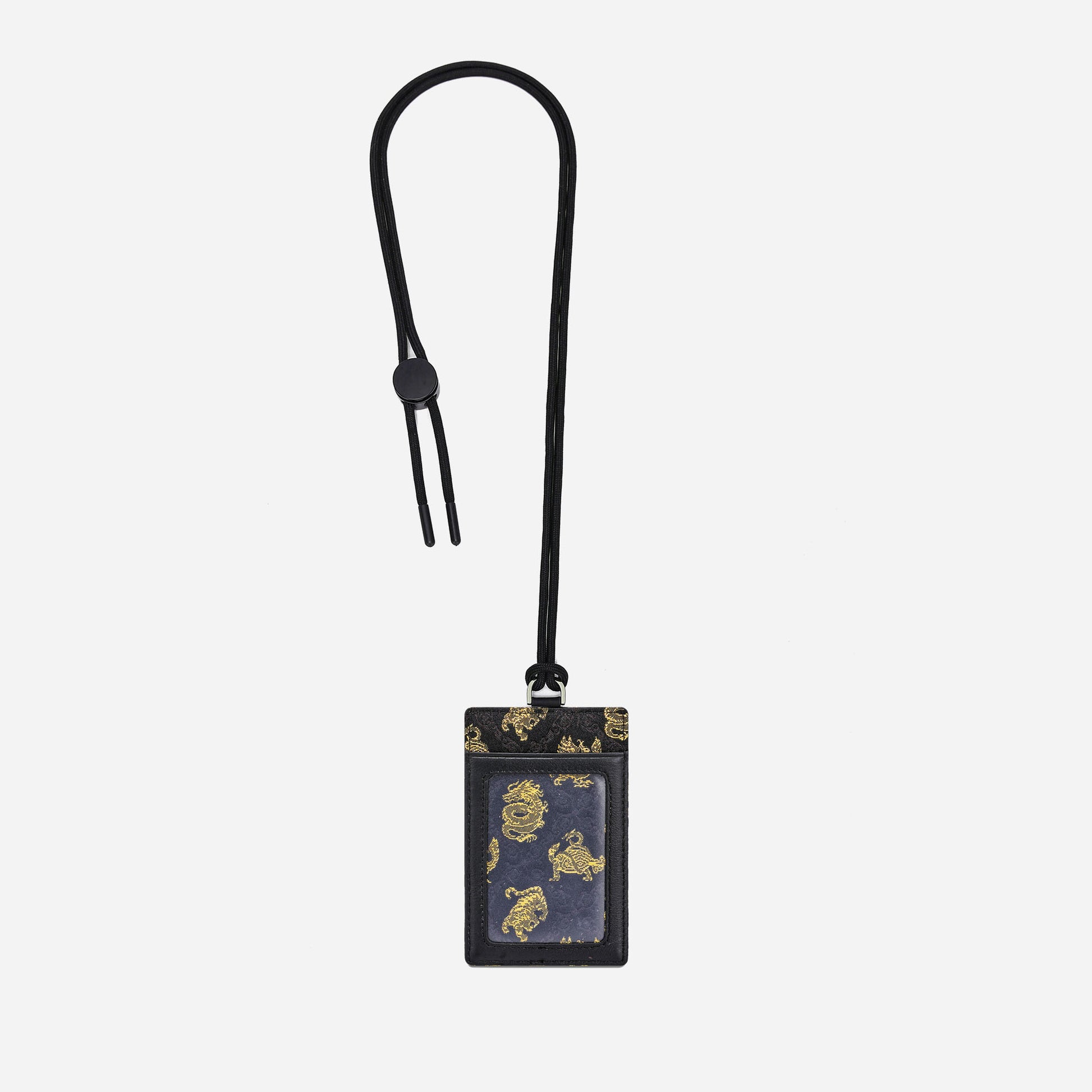 This Vertical Card Holder is crafted from luxurious Japanese Nishijin-ori and black-grained calfskin for a fashionable and functional look. With three card slots and a transparent badge window, you can easily organize and store your ID and credit cards. The adjustable and removable shoulder strap makes it comfortable to wear around your neck or hook to a bag.